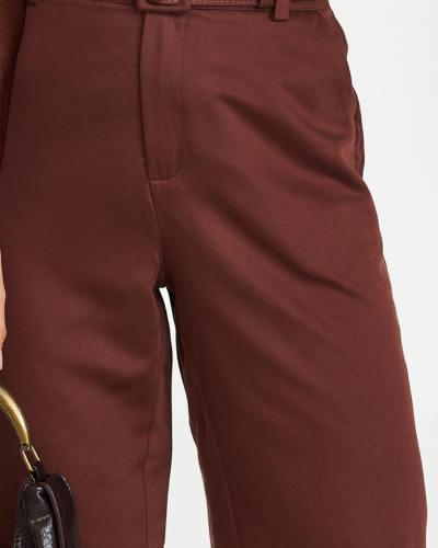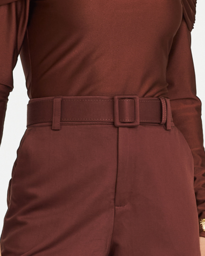 Cós mais alto com passantes e encaixe preciso, valorizando a região da cintura e organizando a proporção da peça no corpo. |