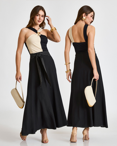 A combinação de cores neutras cria um visual equilibrado e moderno, ideal para quem busca sofisticação com o toque criativo. A divisão frontal alonga a silhueta e garante destaque imediato á peça. |