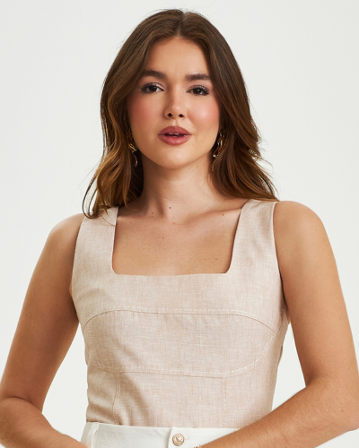 Decote quadrado e recortes modernos deixam a peça atemporal e fashionista. |