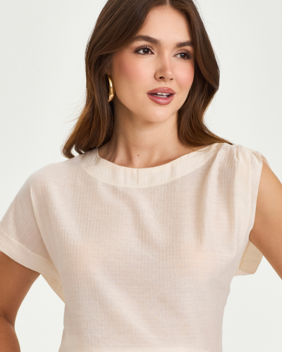 O destaque está no desenho das mangas: de um lado, uma queda suave; do outro, um leve franzido no ombro, criando volume preciso e um ponto de interesse que ilumina a silhueta sem exageros.