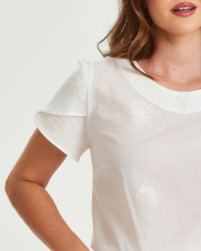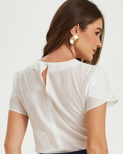 O algodão bordado valoriza a peça com desenhos em relevo que adicionam profundidade e elevam o look sem exageros. |