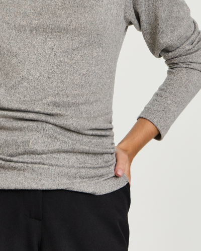 Detalhe aplicado estrategicamente na lateral da peça, criando leve drapeado que valoriza a silhueta e proporciona ajuste mais orgânico ao corpo. | ![]() |