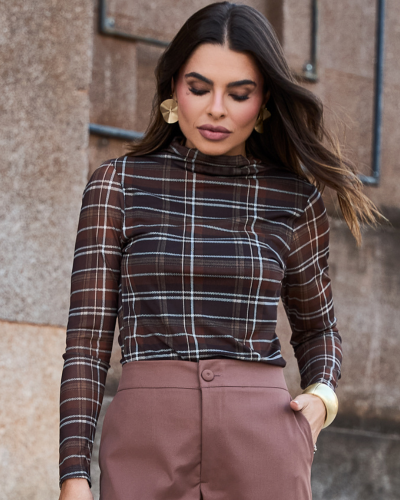 A transparência do tule encontra a estampa xadrez em uma construção que equilibra leveza e presença. Na versão em marrom, o padrão ganha uma leitura mais sóbria e sofisticada, com profundidade nos tons terrosos que reforçam a proposta elegante da peça. A blusa Samira desenha o corpo com suavidade, enquanto o forro interno garante segurança ao vestir e um acabamento mais limpo, mantendo conforto e refinamento.