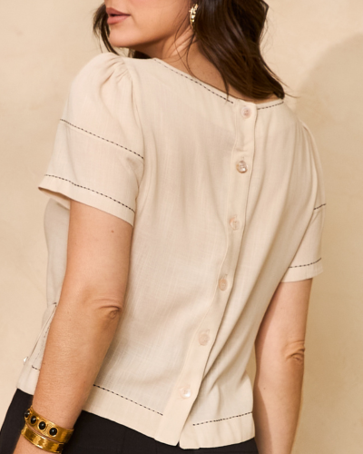 O fechamento posterior com botões traz um diferencial delicado, que transforma o básico em uma peça sofisticada. | ![]()