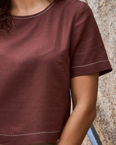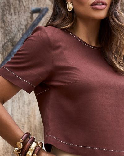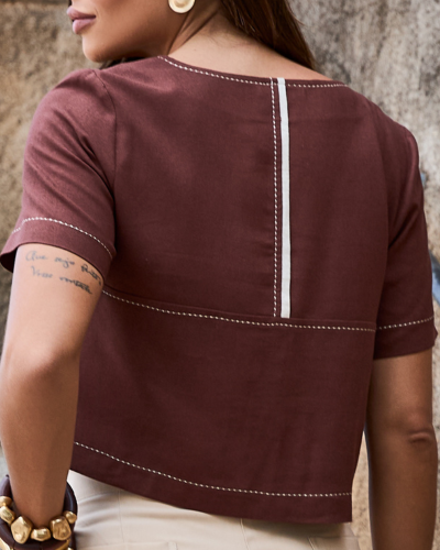 Leveza natural e acabamento marcante se encontram em uma peça pensada para elevar o essencial. O viscolinho entrega toque fresco e caimento agradável, enquanto os pespontos aparentes desenham a construção com personalidade sutil. O shape reto e levemente curto facilita combinações e traz um visual atual, perfeito para transitar entre produções casuais e propostas mais elegantes.