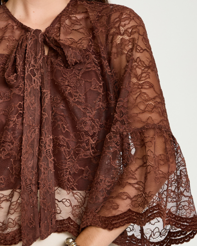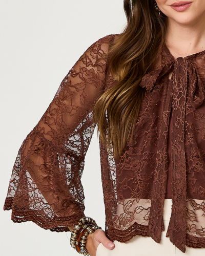 Renda floral com transparência equilibrada e desenho delicado define a blusa Vaniela, criada para composições elegantes e sofisticadas. A peça acompanha top em algodão, que proporciona conforto e cobertura sem interferir na leveza visual da renda. O modelo apresenta mangas amplas com recorte e barra rendada, além de faixa para amarração no decote que adiciona feminilidade ao design. O comprimento levemente encurtado valoriza a silhueta e facilita a combinação com peças de cintura alta.