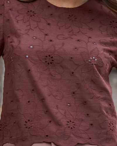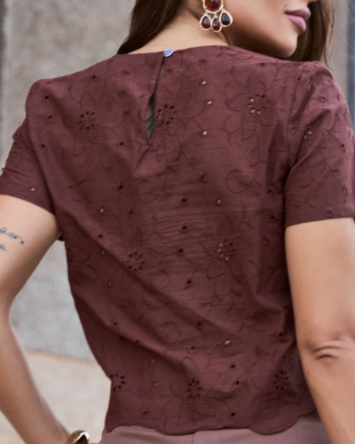 O trabalho em laise conduz a peça com um desenho floral vazado que cria textura e leve transparência pontual, sem comprometer a cobertura. O algodão puro mantém o toque macio e respirável, enquanto o acabamento na barra levemente ondulada reforça a delicadeza da construção. Uma proposta que equilibra frescor e acabamento bem definido no corpo.