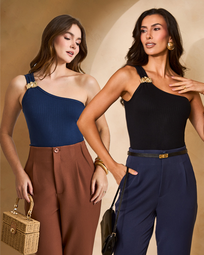 O acessório metálico no ombro é o ponto de destaque da peça, adicionando um toque de sofisticação que transforma o básico em especial. | ![]()