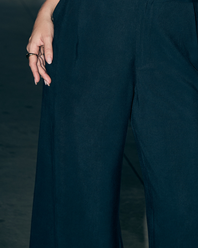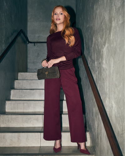 Estrutura alinhada e caimento fluido definem a proposta da calça Roberta. Desenvolvida em alfaiataria de viscose com elastano, combina firmeza na construção com elasticidade suave, proporcionando conforto ao longo do dia. A modelagem de cintura média com pernas amplas alonga visualmente a silhueta e cria movimento elegante ao caminhar. O cós estruturado valoriza o encaixe na cintura, enquanto o cinto de courino com fivela dourada acrescenta contraste sofisticado e acabamento marcante à composição.