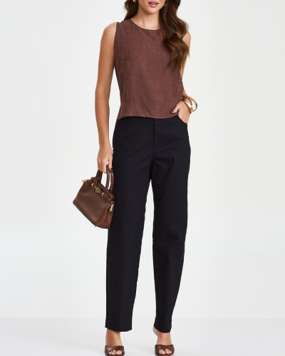 A costura reforça a estrutura da calça, mantendo o visual organizado e valorizando a silhueta com acabamento preciso. |