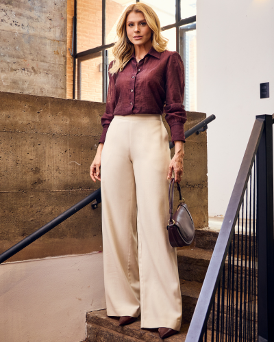 Linhas limpas e caimento fluido definem a calça Rafaela, desenvolvida em alfaiataria de viscose que proporciona toque macio e movimento elegante ao caminhar. A modelagem reta alonga a silhueta e valoriza composições com peças estruturadas ou blusas mais leves. O fechamento lateral com zíper mantém a frente limpa, enquanto o elástico no cós traseiro contribui para melhor adaptação ao corpo e mais conforto no vestir.