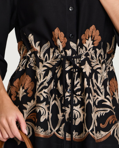 Base em viscose de toque macio e caimento fluido que recebe aplicação de bordado localizado, trazendo textura e acabamento sofisticado á peça. |