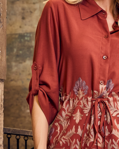A leveza da viscose encontra o trabalho detalhado do bordado nesta camisa que combina elegância e riqueza de acabamento. A peça apresenta modelagem alongada com caimento fluido, gola clássica e abotoamento frontal, criando uma base atemporal que valoriza diferentes composições.