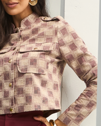 Estrutura encorpada com textura visível define o casaco Leticia. A mistura de algodão com lã traz um toque mais denso e levemente rústico, enquanto a construção em alfaiataria organiza o caimento com precisão. Os botões de pressão deixam o fechamento mais limpo e prático, e os martingales nas mangas introduzem ajuste sutil, criando uma peça que equilibra funcionalidade e presença visual.
