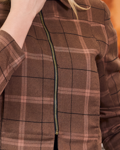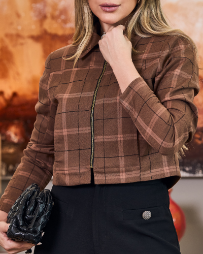 Uma peça que trabalha proporção e presença ao mesmo tempo. A base de alfaiataria com elastano traz estrutura, mas permite mobilidade real, enquanto o comprimento levemente encurtado reposiciona a silhueta e cria contraste com peças de cintura mais alta. O xadrez entra como elemento gráfico, não óbvio, e o zíper frontal assume protagonismo, quebrando a estética clássica da alfaiataria com um eixo mais contemporâneo.
