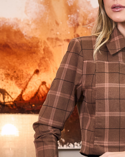 O xadrez surge em base marrom com linhas bem definidas, trazendo leitura mais atual e menos tradicional dentro da proposta de alfaiataria. |