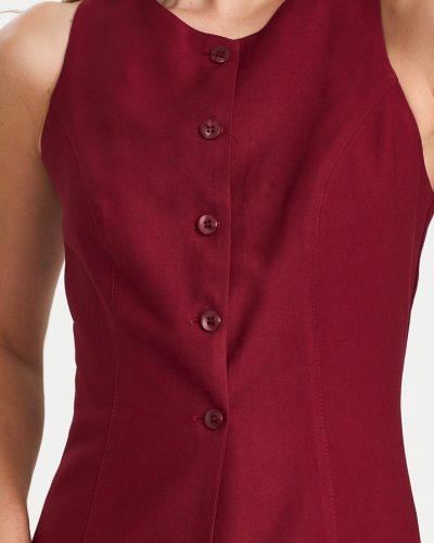 O design cavado valoriza os ombros e traz leveza ao visual. Os recortes acompanham o corpo e reforçam a construção de alfaiataria da peça. | ![]() |