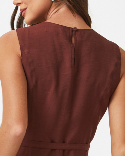 Alfaiataria que equilibra leveza e presença em uma construção pensada para valorizar o corpo sem rigidez. O conjunto em viscose com linho entrega frescor, caimento fluido e textura naturalmente sofisticada. A blusa sem mangas ganha recortes estratégicos e transpasse frontal que alonga a silhueta, além do botão dourado aplicado no ombro, que adiciona ponto de luz ao look. O fechamento nas costas por botão mantém a frente limpa e refinada. O cinto fino marca a cintura com delicadeza, enquanto a calça de modelagem reta acompanha com caimento solto, criando uma linha contínua elegante.