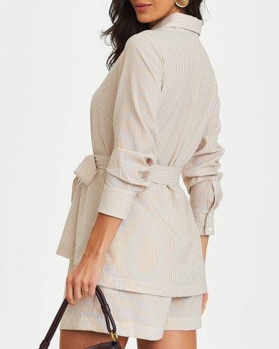 Alfaiataria leve com mistura de viscose e poliamida, trazendo toque macio, menor amassamento e caimento mais estável ao longo do uso. A camisa tem proposta alongada com faixa do mesmo tecido, permitindo ajuste na cintura e variação de styling — mais marcada ou solta. O shorts segue a mesma base, com estrutura equilibrada e comprimento que acompanha a proposta do conjunto. A padronagem em listras finas reforça a leitura alinhada, com um visual atual que transita entre o casual refinado e o uso mais arrumado.