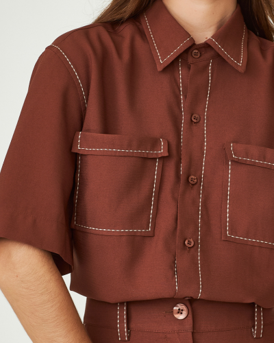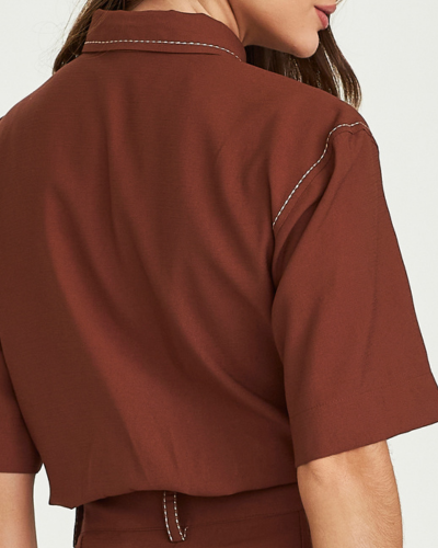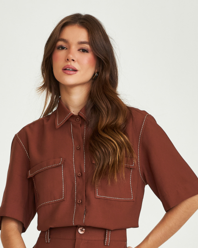 A alfaiataria surge em uma leitura leve e atual, marcada pelos pespontos aparentes que valorizam o design da peça. A camisa ampla de manga curta traz caimento solto e confortável, equilibrando estrutura e fluidez. O shorts curto acompanha a proposta com corte limpo e proporções modernas, formando um conjunto alinhado, sofisticado e cheio de personalidade.