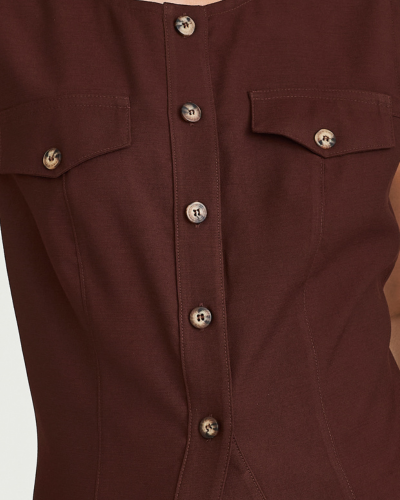 As lapelas no busto trazem referência utilitária elegante, enriquecendo o deisign sem pesar a composição. |