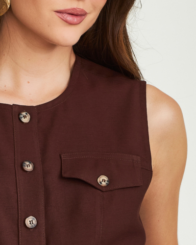 A alfaiataria aparece em uma proposta limpa e sofisticada, com linhas bem definidas e caimento estruturado que valoriza a silhueta. O colete sem mangas traz presença elegante, enquanto o shorts saia equilibra feminilidade e precisão no corte. A construção da peça destaca detalhes funcionais e acabamento refinado, resultando em um conjunto moderno, alinhado e fácil de compor.