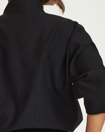 A jaqueta possui elástico com regulagem interna e ponteiras metálicas permitindo ajuste personalizado na barra, podendo ser usada mais solta ou levemente ajustada ao corpo. |