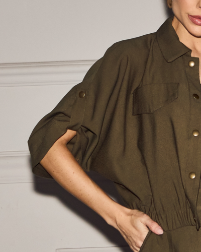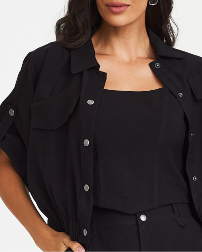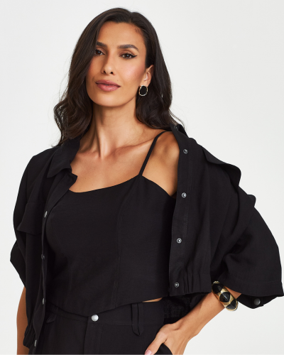 Volume amplo com ajuste estratégico cria uma peça que mistura utilitário e sofisticação de forma precisa. A jaqueta traz construção mais solta, mas é reposicionada pelo elástico na barra, formando um shape levemente blusado que valoriza a cintura sem marcar. Os botões de pressão reforçam a estética funcional, enquanto o martingale nas mangas adiciona um detalhe clássico reinterpretado. Em conjunto com o top, a proposta ganha profundidade e constrói um visual atual dentro da alfaiataria leve.