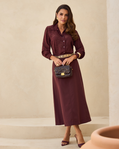 Silhueta elegante com comprimento midi e construção estruturada que valoriza a cintura e cria movimento na medida certa. Confeccionada em alfaiataria, a peça traz presença e acabamento refinado, equilibrando sofisticação e leveza visual. A modelagem levemente evasê proporciona fluidez ao caminhar, enquanto os recortes estratégicos reforçam o design contemporâneo e atemporal.