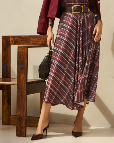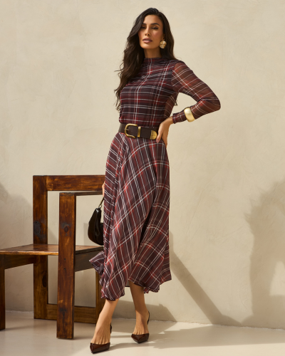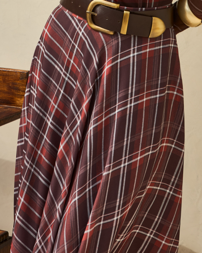 O xadrez aparece aqui com leitura mais fluida e atual, desenhado sobre o crepe leve que acompanha o movimento com naturalidade. A saia Vanessa em modelagem godê amplia o desenho da peça e cria um caimento circular que valoriza cada passo. Os recortes em viés quebram a rigidez da padronagem e trazem um efeito mais orgânico ao visual. O comprimento midi equilibra presença e leveza, enquanto a construção limpa permite composições que vão do alinhado ao descomplicado.