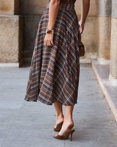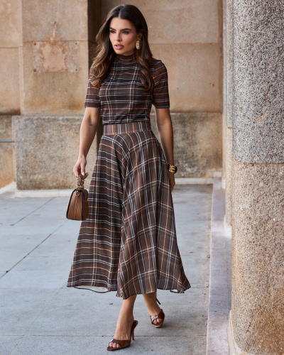 O xadrez aparece aqui com leitura mais fluida e atual, desenhado sobre o crepe leve que acompanha o movimento com naturalidade. A saia Vanessa em modelagem godê amplia o desenho da peça e cria um caimento circular que valoriza cada passo. Os recortes em viés quebram a rigidez da padronagem e trazem um efeito mais orgânico ao visual. O comprimento midi equilibra presença e leveza, enquanto a construção limpa permite composições que vão do alinhado ao descomplicado.