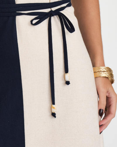 O vestido Izabela explora o contraste de cores como elemento central do design. A construção em viscolinho garante leveza e movimento, enquanto o recorte bicolor alonga a silhueta de forma natural. O cinto em cordão com ponteiras de resina finaliza a peça com um detalhe artesanal e atual, permitindo ajuste na cintura e diferentes formas de uso ao longo do dia.