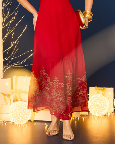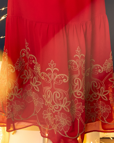O Eloiza nasce do encontro entre movimento e brilho. O crepe bordado ganha protagonismo sem esforço: ele desenha flores douradas na barra como se fossem luz refletida, criando um contraste elegante com o vermelho profundo do tecido.