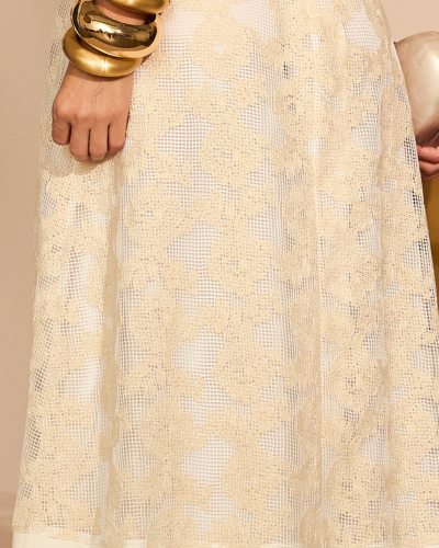 A parte superior, com linhas limpas e estruturadas, equilibra a fluidez da saia rendada, que ganha ainda mais destaque com o barrado em tecido liso e o acabamento impecável.