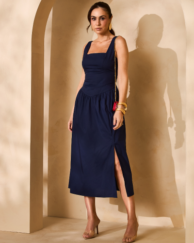 A modelagem ajustada ao corpo destaca a silhueta de forma sutil, enquanto a saia evasê com recorte enviesado e fenda lateral acrescenta movimento e modernidade. O decote quadrado, clássico e feminino, harmoniza perfeitamente com as alças médias e o recorte marcante na cintura, criando um visual equilibrado entre o casual chic e o elegante.