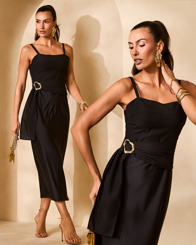 A faixa que passa a cintura e encaixa na argola dourada dá destaque á cintura e adiciona um toque moderno e elegante, elevando o vestido a um patamar de sofisticação. |