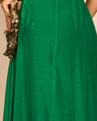 A modelagem longa acompanha o corpo com fluidez, criando um desenho contínuo que valoriza cada movimento. Um vestido pensado para iluminar ocasiões especiais sem perder a naturalidade, perfeito para celebrar com elegância e conforto.