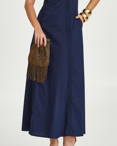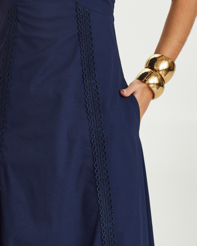 Em tricoline com poliamida, o vestido Caroline combina estrutura e leveza em uma silhueta que alonga com elegância. O recorte geométrico no busto adiciona um toque sutil de modernidade, enquanto os recortes com renda embutida criam linhas verticais que afinam o visual. O caimento solto e os detalhes delicados tornam a peça uma escolha versátil — ideal para jantares, eventos ou produções mais descontraídas com charme refinado.