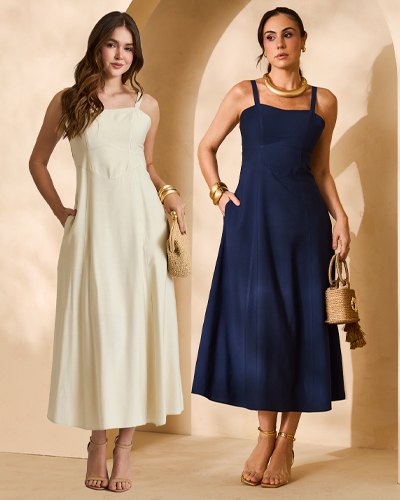 Um vestido curinga que transita entre o dia e a noite. Combine com sandálias de salto e acessórios dourados para um visual elegante, ou com flats e bolsas de palha para uma proposta mais leve e casual. | ![]() |